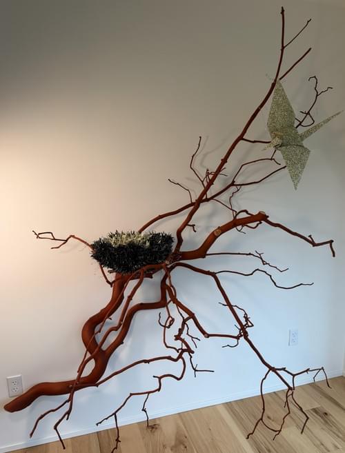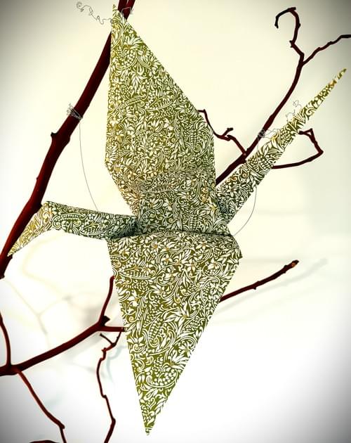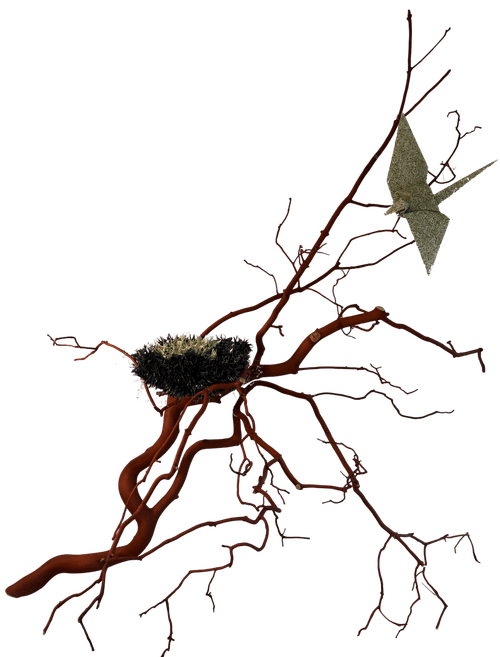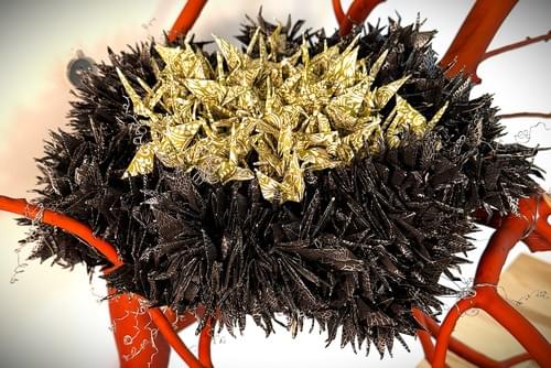 This artwork created by Jane Ellen (one of our greatest supporters) is a meditation on grief, resilience, and collective renewal. Created through a ritual process guided by the cycles of the Moon, the piece is composed of 1,000 hand-folded peace cranes, each serving as an invocation for unity, compassion, and healing. The nest forms a protective container—holding humanity through its darkest moments while nurturing the potential for rebirth and hope. Above its heart descends the Great Mother crane, symbolizing unwavering protection, empathy, and living love—an embodiment of care that revives and holds all of humanity as we find our way forward together.